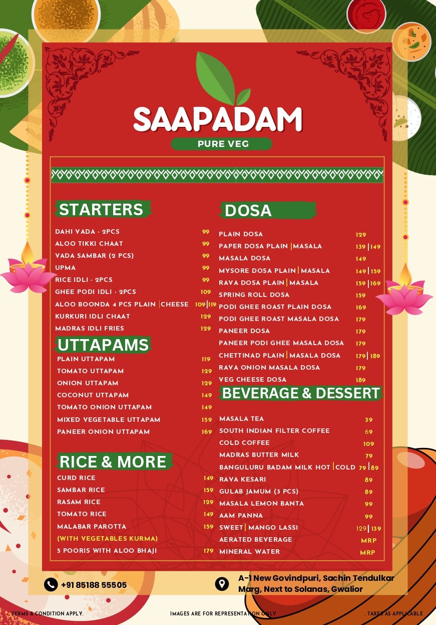 Welcome to Saapadam, your new favourite destination in Gwalior for authentic, pure vegetarian South Indian food. Located at A-1 New Govindpuri, Sachin Tendulkar Marg, Next to Solanas, Saapadam brings you the rich flavours, aroma, and warmth of South Indian cuisine in its purest form.